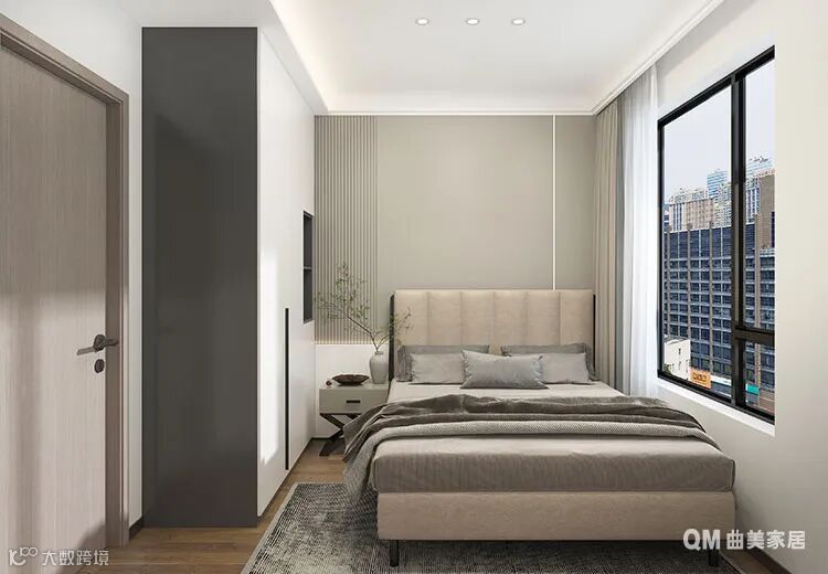 同样的白色衣柜,搭配一张大床和一个杌式床头柜,简单有效的构建了一个客卧的基本功能,当然,床头护墙依然沿用了主卧格栅的设计,既是风格的延续,也让空间更有层次感。