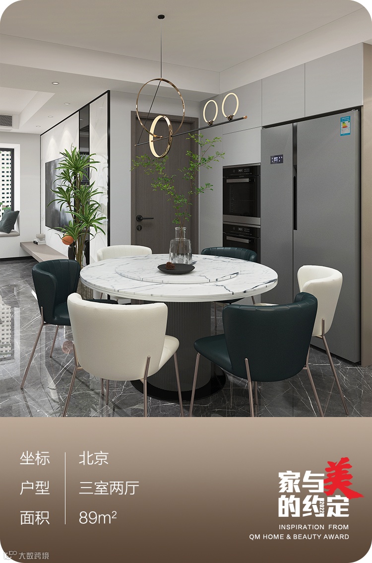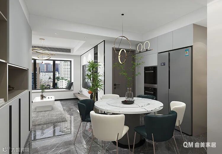 圆形餐桌最大的好处在于更容易营造中式团圆的氛围,搭配黑白相间的餐椅,空间环境既有格调,又极为大气。靠墙一侧做了定制柜,将冰箱、烤箱等纳入其中,旁边的柜体可以放置一些厨用物件。