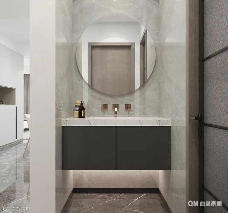 卫生间做了干湿分离设计,盥洗台盆做悬空处理,不给卫生留死角,搭配尺寸适宜的圆形镜框,没有过多修饰,反而更美观大方。