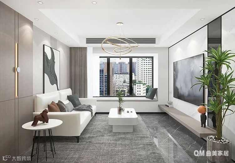 沙发靠墙是一幅简洁的艺术画作,灰白二色的应用为空间增加了一抹生动;摒弃了略显拥挤的电视柜,以横板的设计增加空间层次感,同样也可以摆放一些艺术品以彰显户主的审美。一侧绿植为客厅增添了一抹自然生机。整体空间富有层次,少一分多一分都嫌不足。