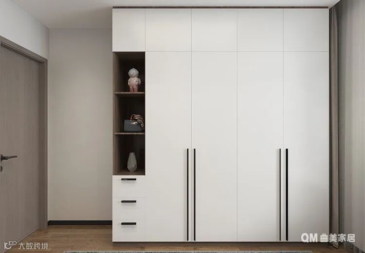 白色衣柜搭配黑色把手,黑白间的强烈色差让设计语言更有表现力。一些工艺品或者包包可以放置在一侧的空格中,以细节去吸引人的感官。