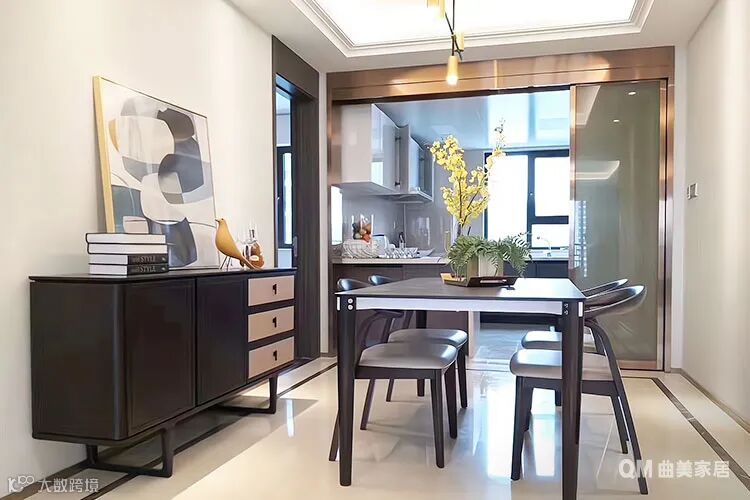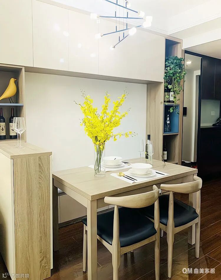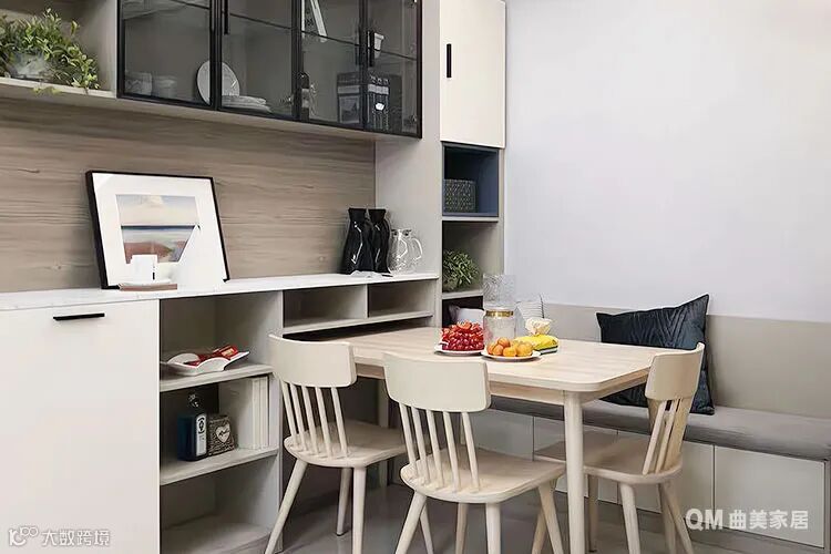 想在小餐厅塞下柜子、桌子和椅子,旁边走道就会变得狭窄,不如试试卡座的形式,紧贴墙面与旁边的餐边柜做一体化处理,座位下面还能存放物品,餐桌也能偏向墙角位置摆放,给走路通道腾出更多空间。