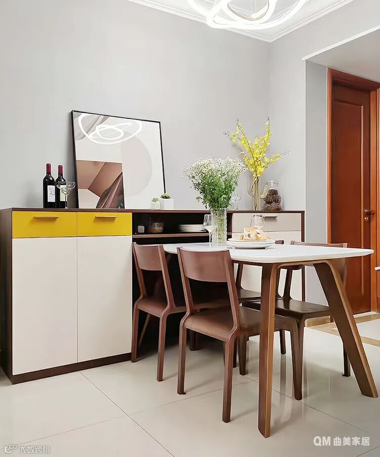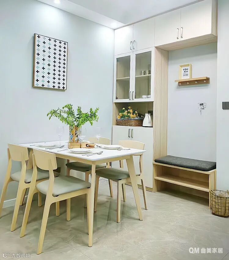 餐厅面积不大,可以定制半高的柜子,墙面部分留白,视觉上感觉无压力。