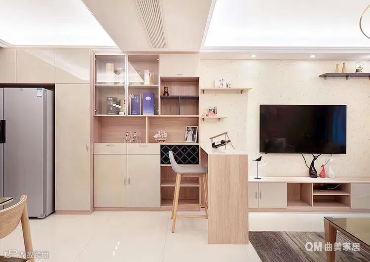 客餐厅位于同一方正空间中,可以将电视墙和餐边柜连为一体,包括嵌入摆放的冰箱,一整面墙解决所有收纳问题。餐边柜处增加吧台,作为客厅和餐厨空间的分隔。