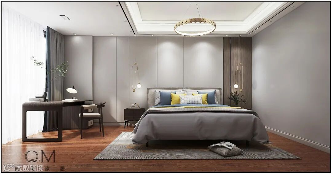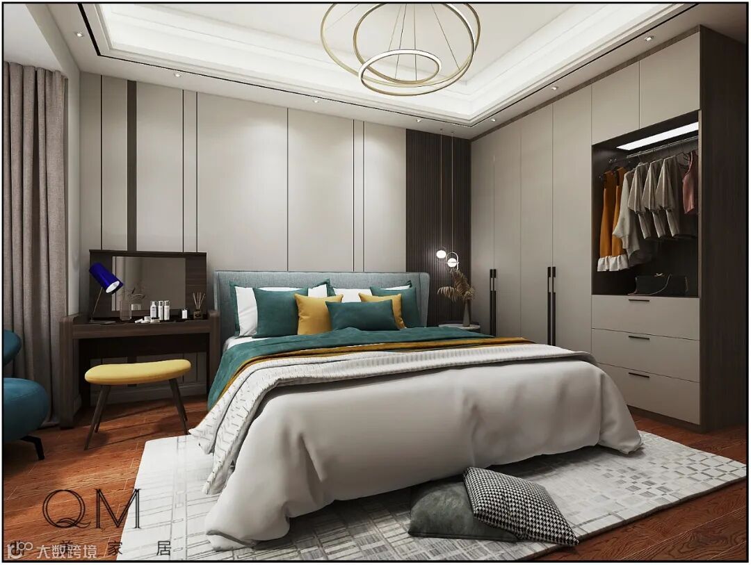 主卧空间利用色彩渲染出独特的氛围,释放出一种高级美感,将床、衣柜、床头柜、梳妆台、休闲椅和舒适睡眠组合,融入到整个氛围中。