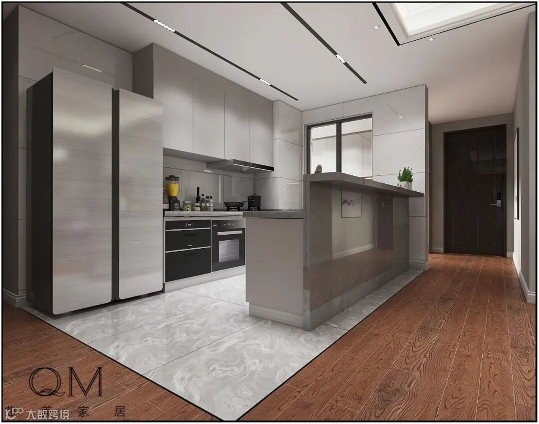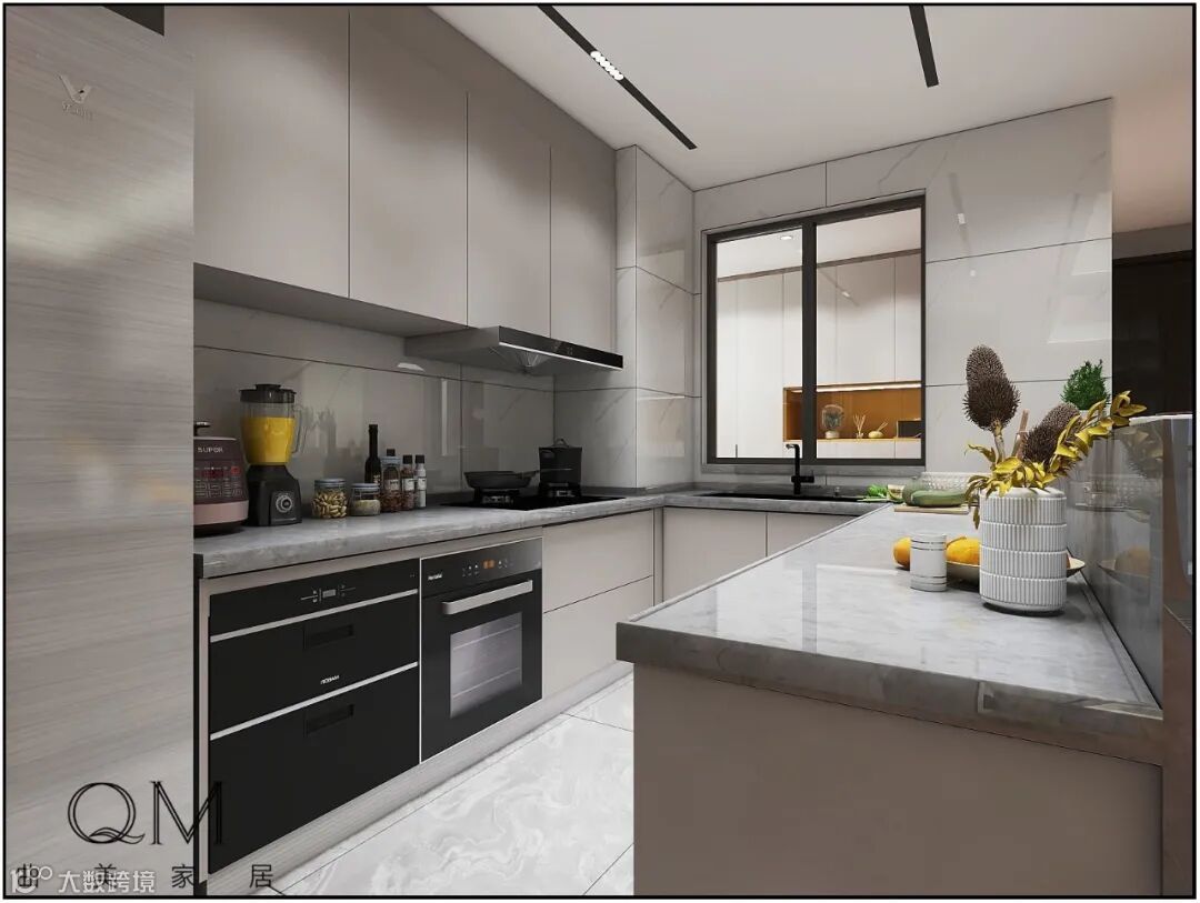 设计师为开放式厨房设计了电器三件套、集成电器两种方案,电器上采用双开冰箱、消毒柜、蒸烤箱等。演示了如何在黑白灰的基调上,设计出有温度、实用又美观的厨房空间。