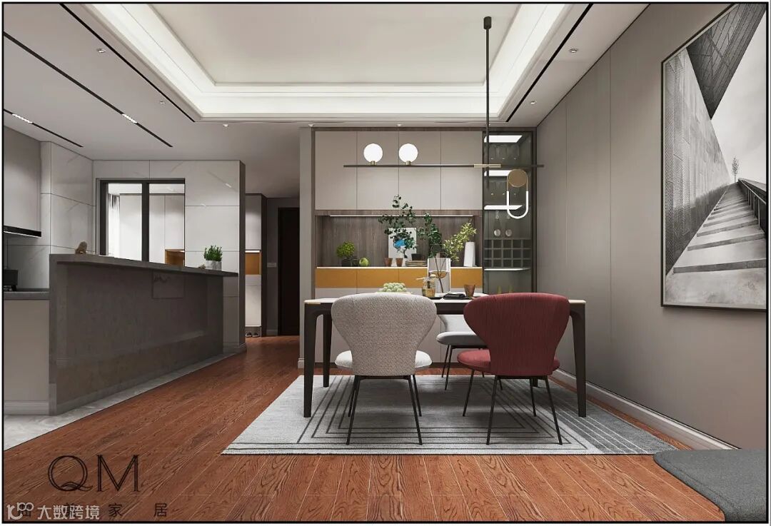 定制餐边柜,装点业主的美好食光,为酒类、餐具、茶具等预留充足的收纳空间;艺术吊灯为餐厅增添了仪式感。整体空间给人以视觉上的变化和舒适感,有颜值更添美味。
