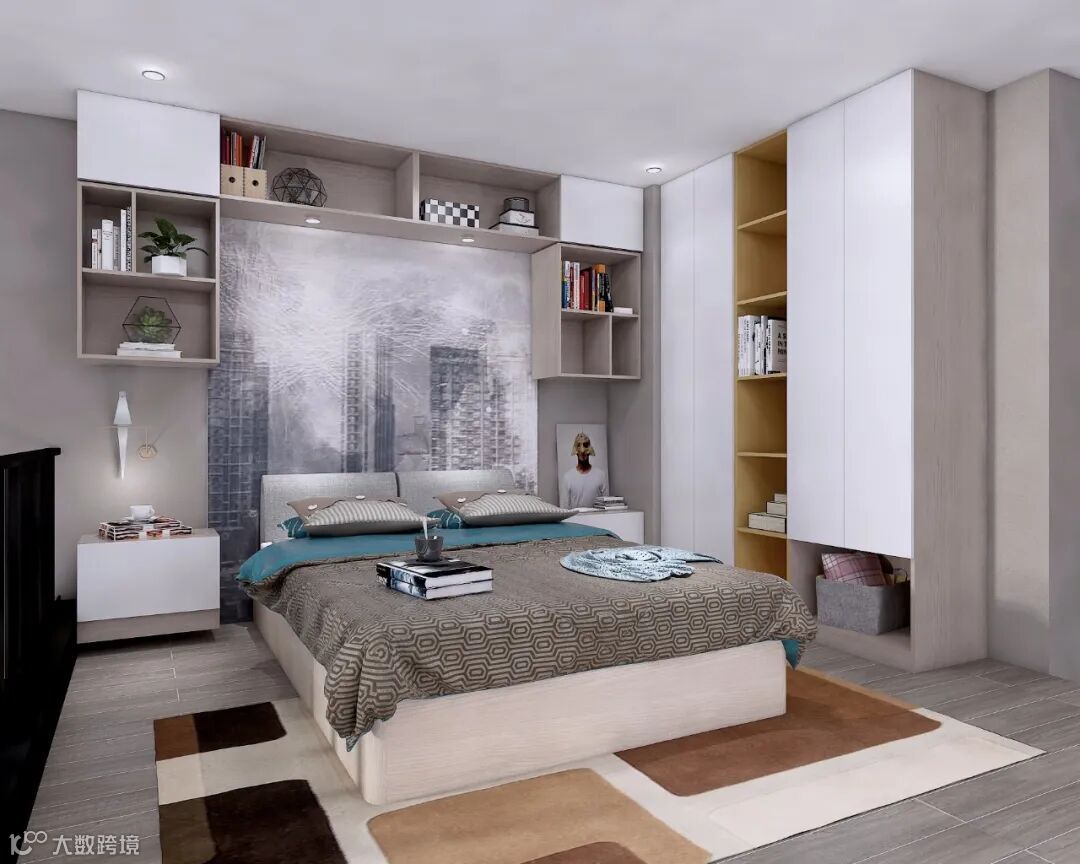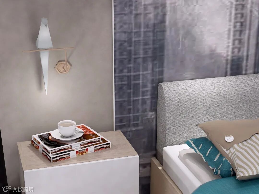 床头背景墙打破了以往的造型设计,定制的整体储物柜错落有序,提供储物空间的同时又不失时尚的元素,一副都市俯瞰背景画,成为卧室的一大亮点。