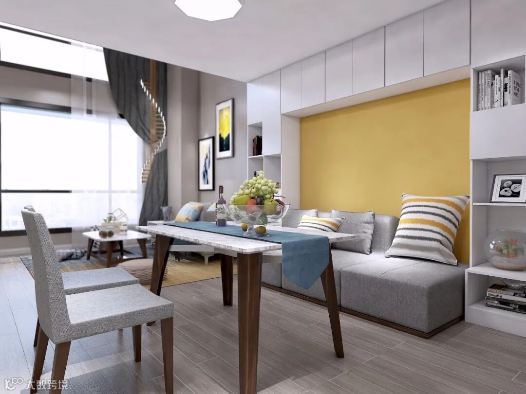 暖黄色的背景墙与蓝色的桌旗,冷暖之间的对比,让空间色彩更加丰富。靠在舒适的靠包上,享用烹制的美味佳肴,幸福感爆棚。