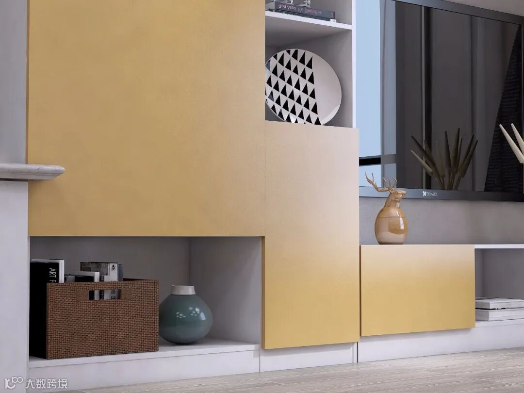 客厅通过暖黄色的挂画与靠包点缀,让空间显得温馨舒适,定制电视柜虚实的分割设计,满足了业主杨先生不同储物需求。