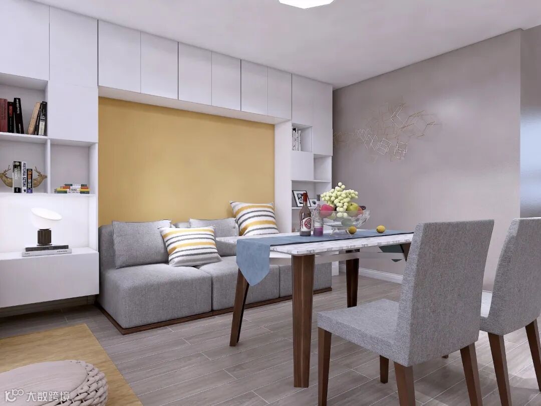 餐厅设计为卡座的形式,这样扩大了餐厨间的过道空间,让空间动线流畅,并且卡座不单单只是做为座位设计,集合餐边柜、书柜与储物柜一起设计。在不到2平米的占地面积向立面发展可以拥有更多的储物量。