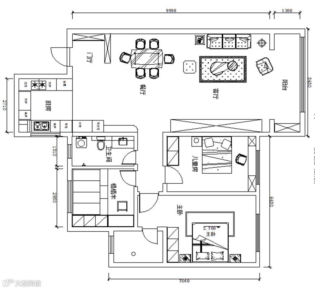 从户型图上看,这套三居室户型方正,采光、通风条件都很不错。