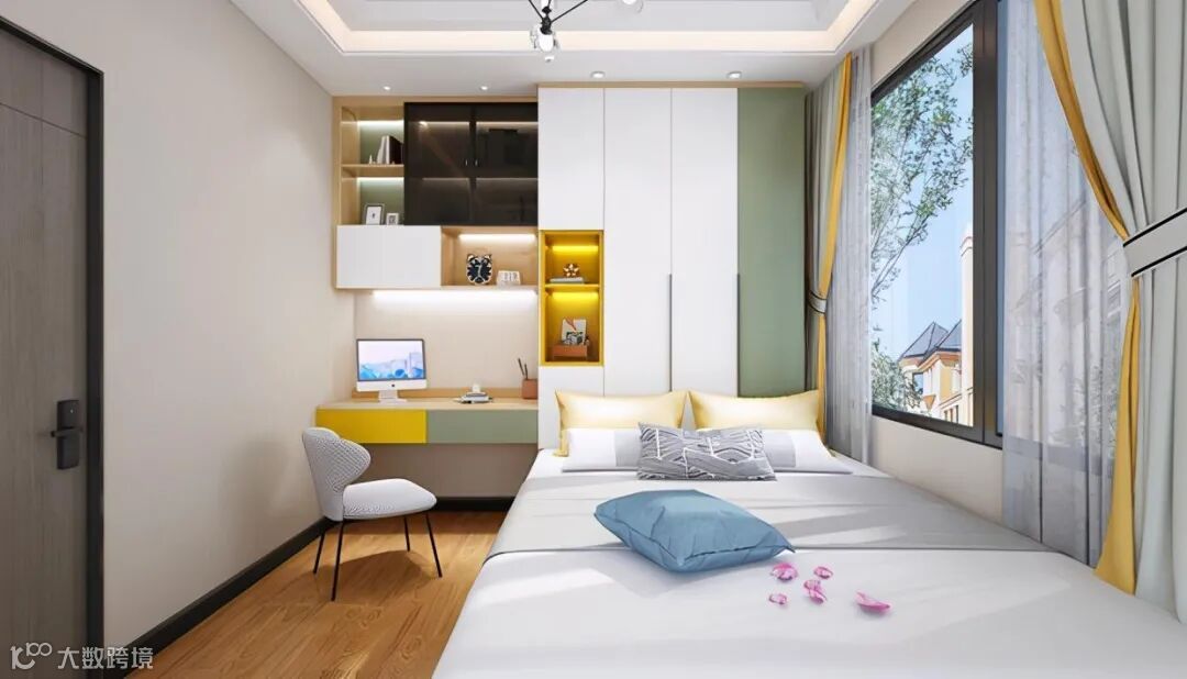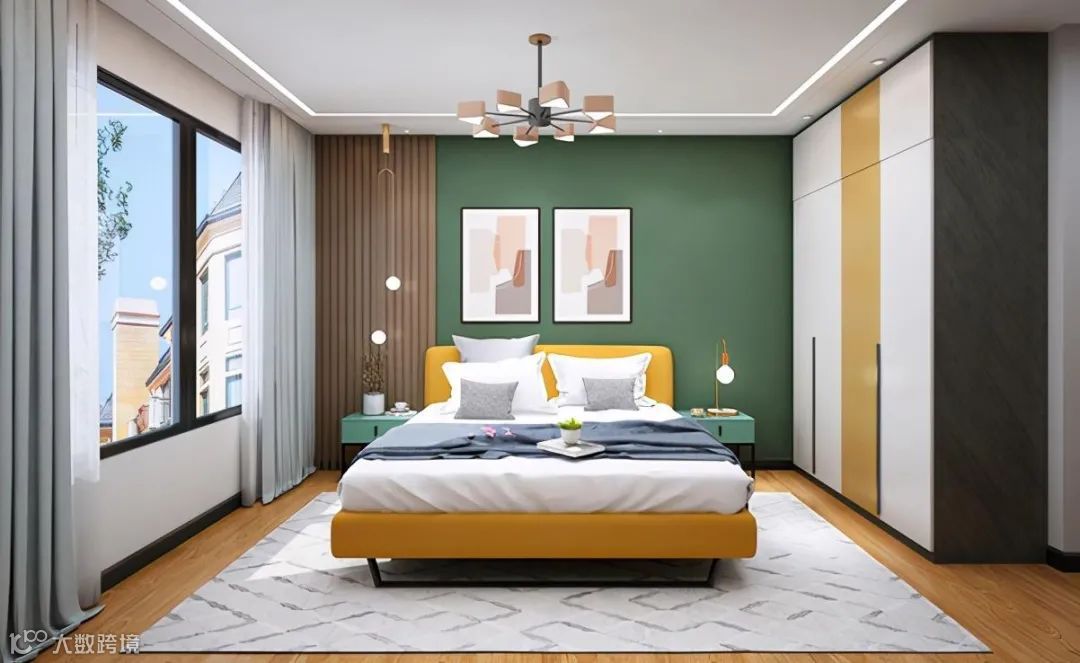 主卧整体风格以简约舒适为主,延续了客厅绿色的搭配,增添了时尚感;通过泛黄的灯光与衣柜、床体以及木地板等暖色调的搭配,营造出一个安逸舒适的睡眠环境。