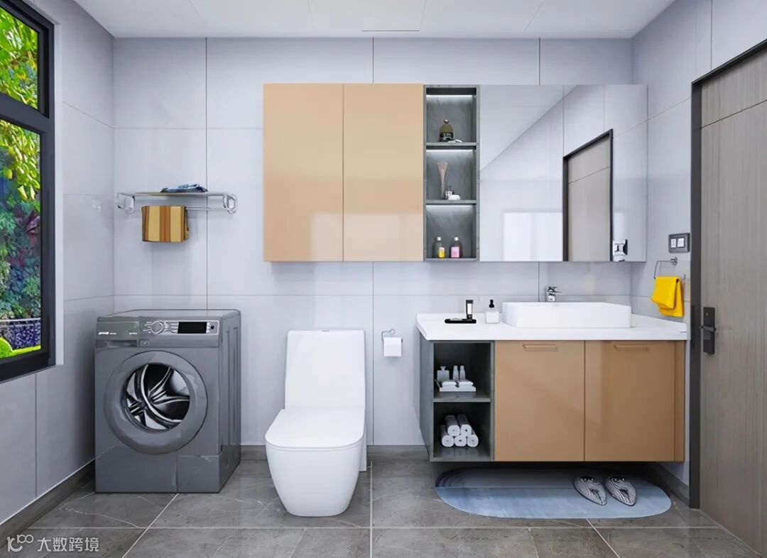 卫生间简洁干净,高级灰地砖与大理石台面,搭配木质柜体,凸显出高贵的气质;灰色的套色格与焦糖色的色彩碰撞,彰显对生活细节的品质要求。为了满足卫生间收纳需求,整个镜柜延伸到了马桶上方,方便存放各种物品。