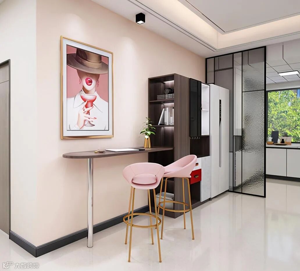 为了满足女主人对办公休闲区的需求,设计师利用玄关对面的位置,设置了一个嵌入式的吧台。旁边开放式书柜,可以放置一些常用的书籍和装饰品。在休闲时间,和家人一起坐在这喝杯咖啡。