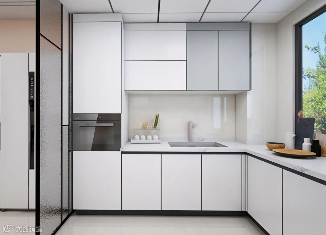 厨房作为家务最繁忙的空间,回归素雅简约才能使生活更显轻松。厨房空间没有使用亮色搭配,整体采用灰沙掠影色与亮白色大胆的色彩碰撞,使整个空间简洁大方。