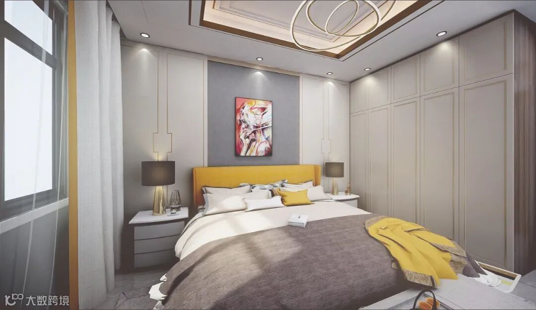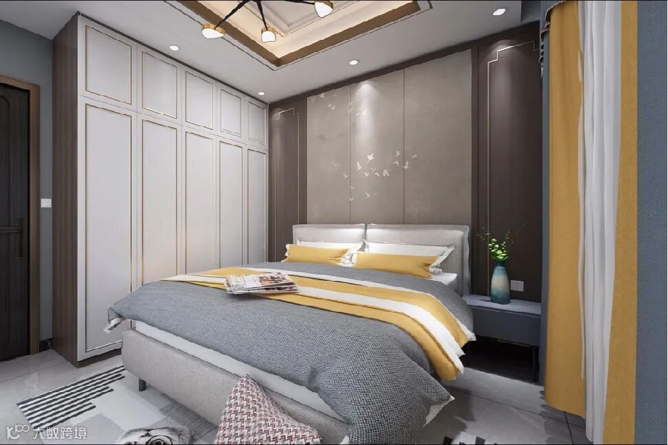 次卧用作父母房,在硬装的搭配上依旧加入金属元素,深色柜体浅色柜门,洋气而不失时尚。黄色元素的点缀,增添了一丝温馨感。