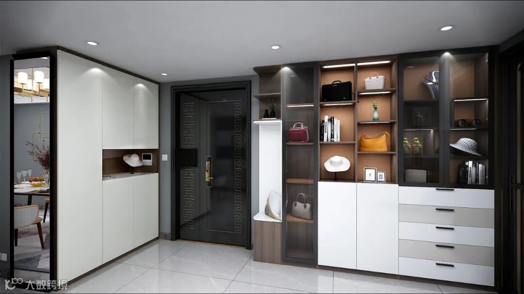 在入户空间中,设计师通过线条、色彩和展示区域的平衡,达到一种宛如“艺廊”现场般的效果。整体注重轻奢华、新时尚的生活品质,门厅只在中间设计开放格作为展示区,营造静谧艺术感。