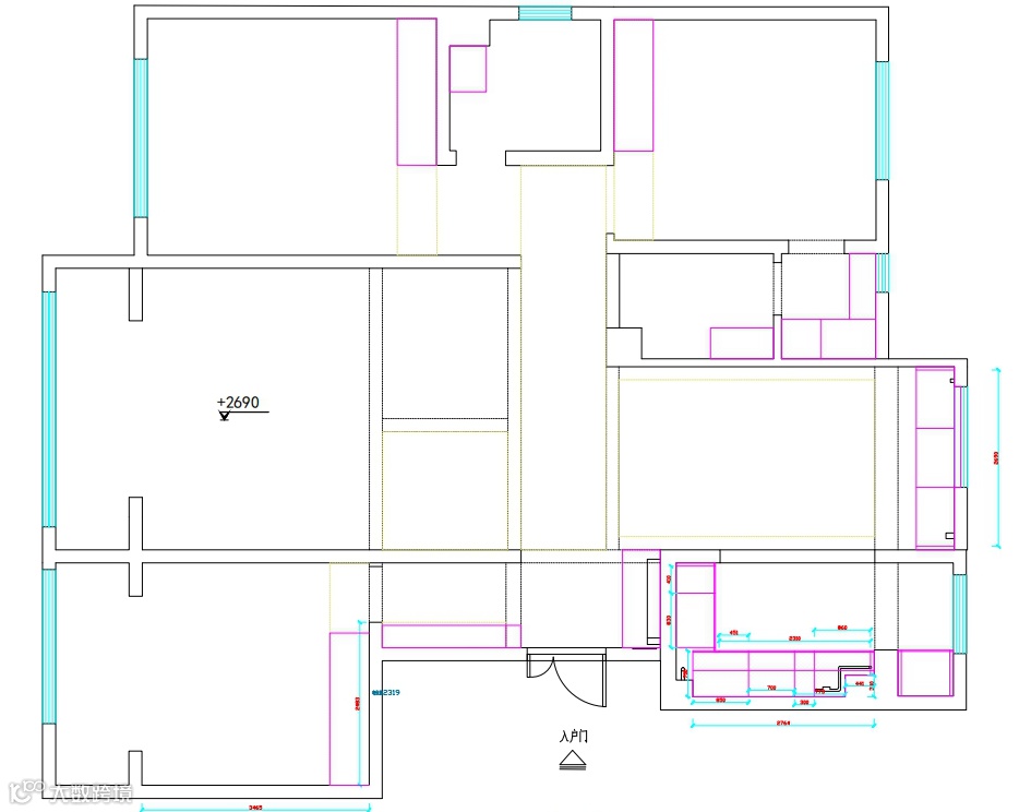 房屋南北对流,采光性好;空间划分明确,视野开阔;客餐厅空间通透,动线流畅。但卧室格局需适当调整,并提升空间利用率。设计师以白色为主色调,搭配灰色、黑色营造舒适典雅的感觉,加上橘黄色的点缀,流畅的家具线条,为业主布置出一个专属的家。