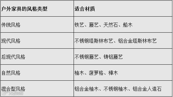 户外家具的材质主要有:金属、木、藤、塑料等;几种材料之间各有优势,可以从摆放位置入手,依据需求选择。