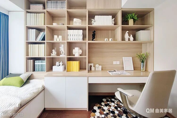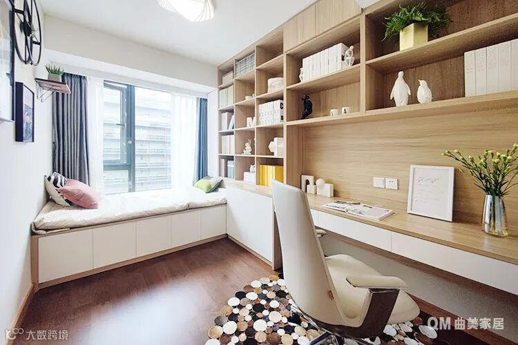 书房是男主人的最爱,每天在这里阅读、思考是他最充实的时光。宽大的窗户下方依旧采用飘窗设计,铺上软垫就成为一个榻榻米,躺在上面小憩或眺望景致都不错。最惬意的是在阳光充足的午后,坐在榻榻米上一边喝茶一边读书,简直不要太幸福~