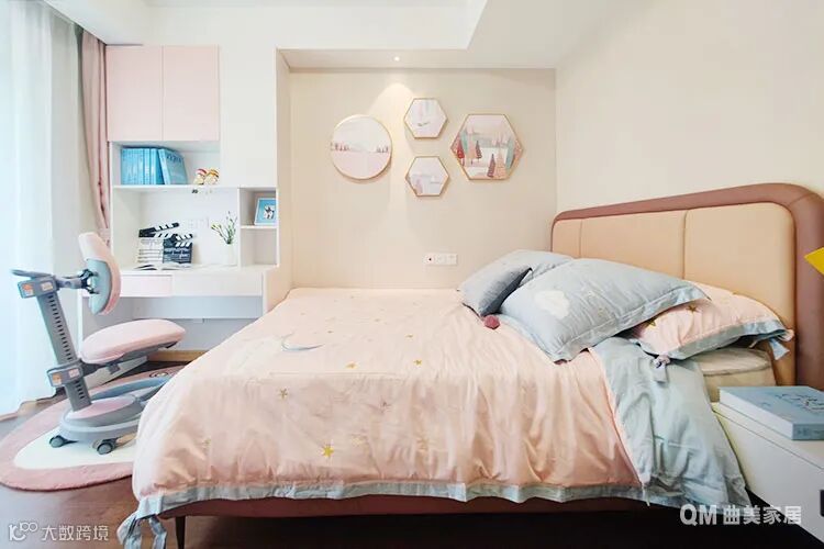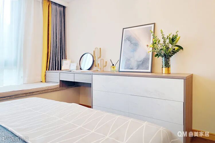 飘窗向一侧延伸打造成“梳妆台”,成为女主人最喜欢的设计。不仅给心爱的瓶瓶罐罐找到了安身之所,而且让每天的化妆过程更有仪式感。