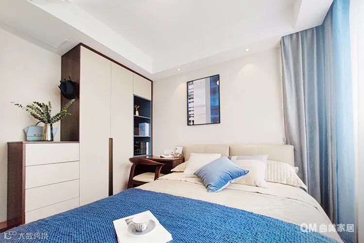 次卧是两位老人的卧房,整体风格素净、稳重。衣柜+抽屉柜组合搭配更方便衣物的拿取和存储。床头柜以小书桌代替,既满足老人读报的需要又能顺手放些常用物品,一物多用,节省空间。