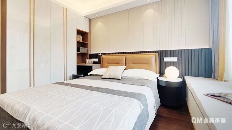 一柜到顶的高光板衣柜容量可观、质感突出,成为主卧空间的亮点。低调简约的护墙板提高隔音、保暖效果,让睡眠更安稳舒适。利落的竖线条纹路增加空间挑高效果,让原本并不大的卧室看上去更宽敞。