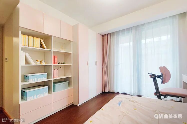 床对面的过道空间也充分利用起来,做了一整面书架,不管以后有多少书都放得下。顶天立地的衣柜容量充足,即便以后女孩渐渐长大也有足够的空间来收纳衣物,同时也会成为她扮靓自己的小天地。