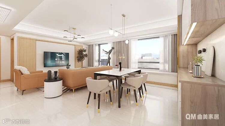 这套户型东、西、北三面都有开阔的窗户,因为舍不得窗外的好景致,所以每个空间都保留开阔的窗景,在室内就能放眼看到城市的繁华,窗外的景色也成为生动的“壁纸”,将空间映衬得格外明亮。