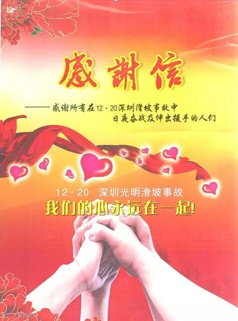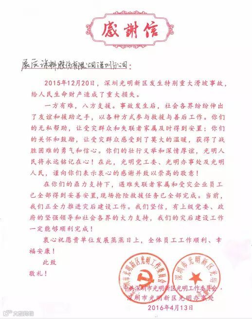 导读:展辰集团深圳公司在光明滑坡事故中积极组织义工队进行援助,帮助救灾,义举得到了光明新区光明工作委员会和光明街道办事处的肯定和感谢。一方有难,八方支援,展辰将一如既往地投身社会公益事业,为社会贡献自己的力