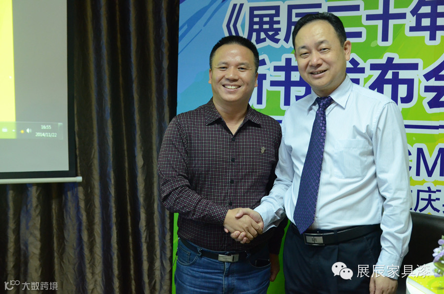 展辰涂料轮值总裁熊星(右)与景初总经理刘永飞(左)握手