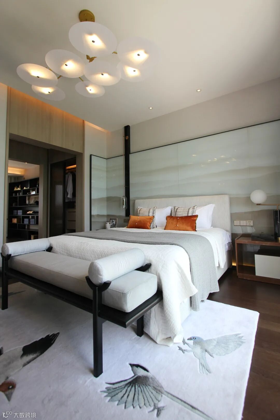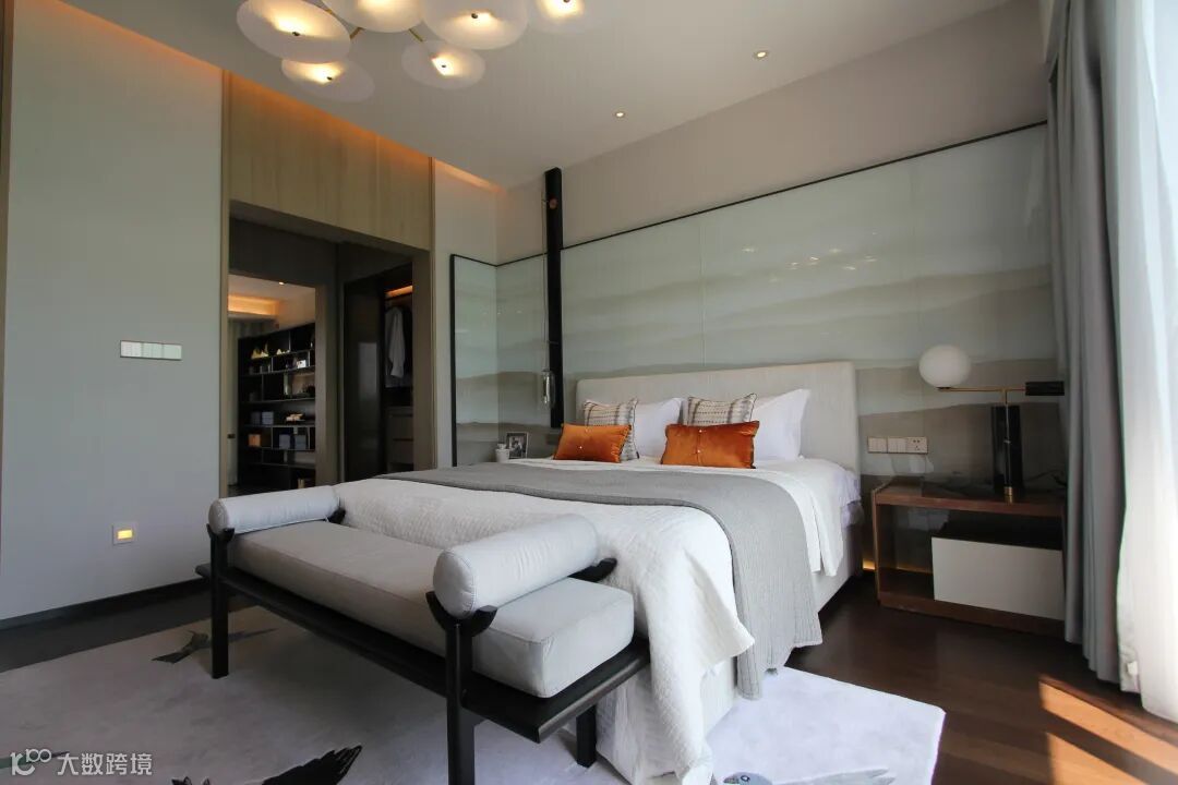 采用自然颜色、质地柔软的材料和山水当中的元素,并配合合适的灯光,打造出具备现代感和功能性的卧室。卧室纯粹、高雅、自然而简约,成为个性化、温暖、满足的生活空间。