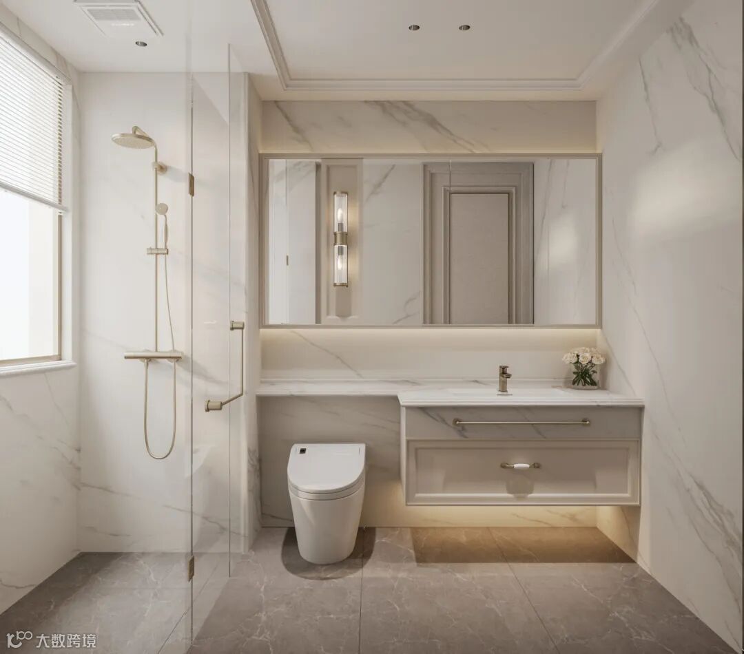 浴室空间简约大气,一天繁忙的工作后,在卫浴间洗去身上的尘埃,洗去身上的疲惫,既放松又舒适。