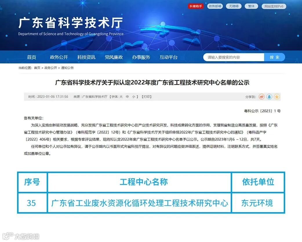 近日,2022年度广东省工程技术研究中心名单已公示,东莞东元环境科技股份有限公司荣获“广东省工业废水资源化循环处理工程技术研究中心”认定!