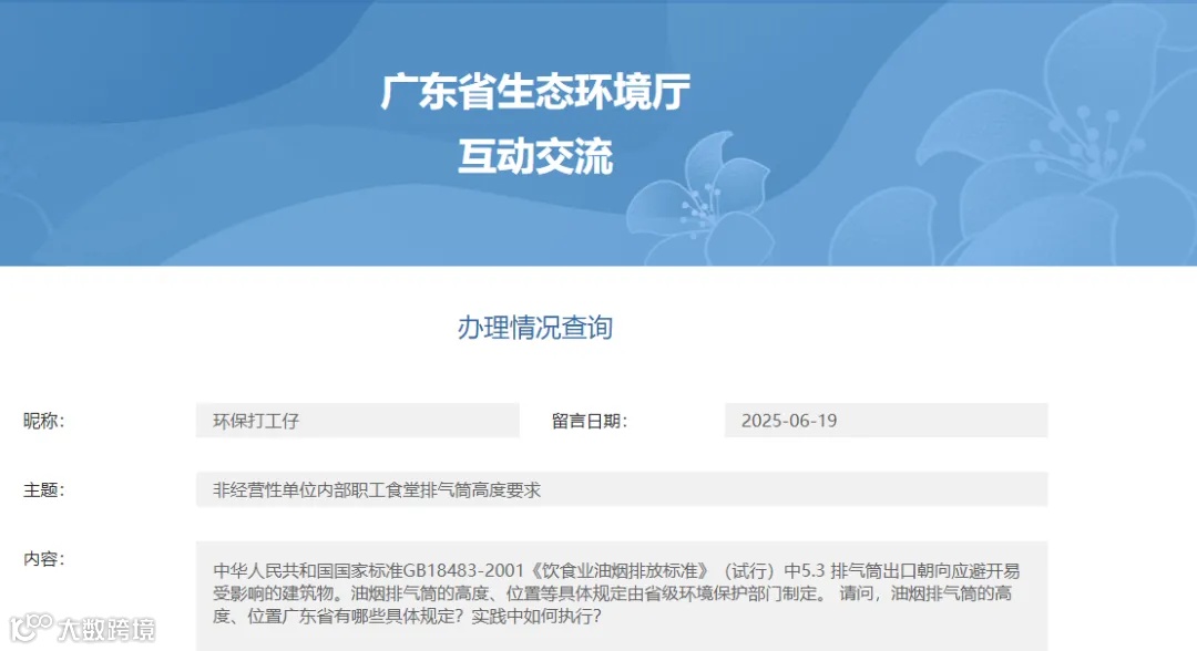 问:中华人民共和国国家标准GB18483-2001《饮食业油烟排放标准》(试行)中5.3排气筒出口朝向应避开易受影响的建筑物。油烟排气筒的高度、位置等具体规定由省级环境保护部门制定。请问,油烟排气筒的高度、位置广东省有哪些具体规定?实践中如何执行?