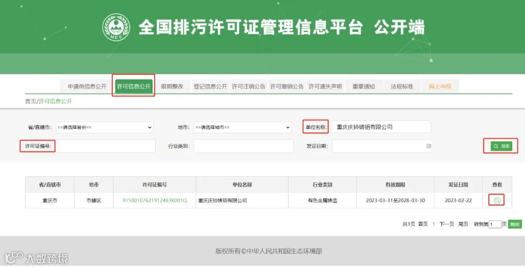 步骤一:登录“全国排污许可证信息管理平台”(http://permit.mee.gov.cn)—>在导航栏中点击“许可信息公开”—>在“单位名称”或“许可证编号”中填写排污单位申请证书时的单位名称全称或许可证编号进行搜索查看。