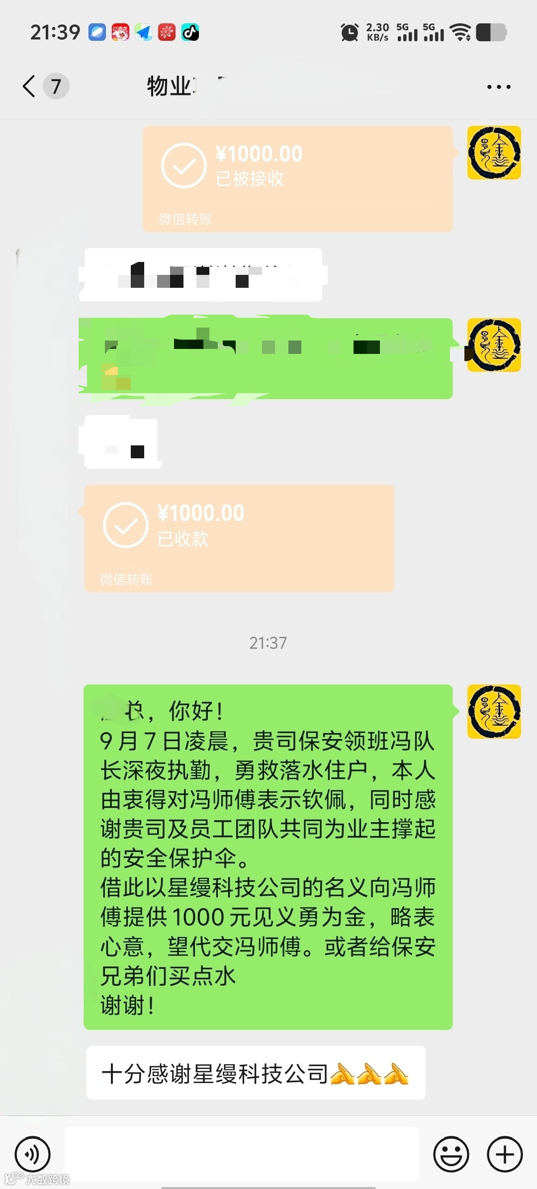 附件1:星缦科技董事长徐先生代表公司向冯队长提供1000元见义勇为金。