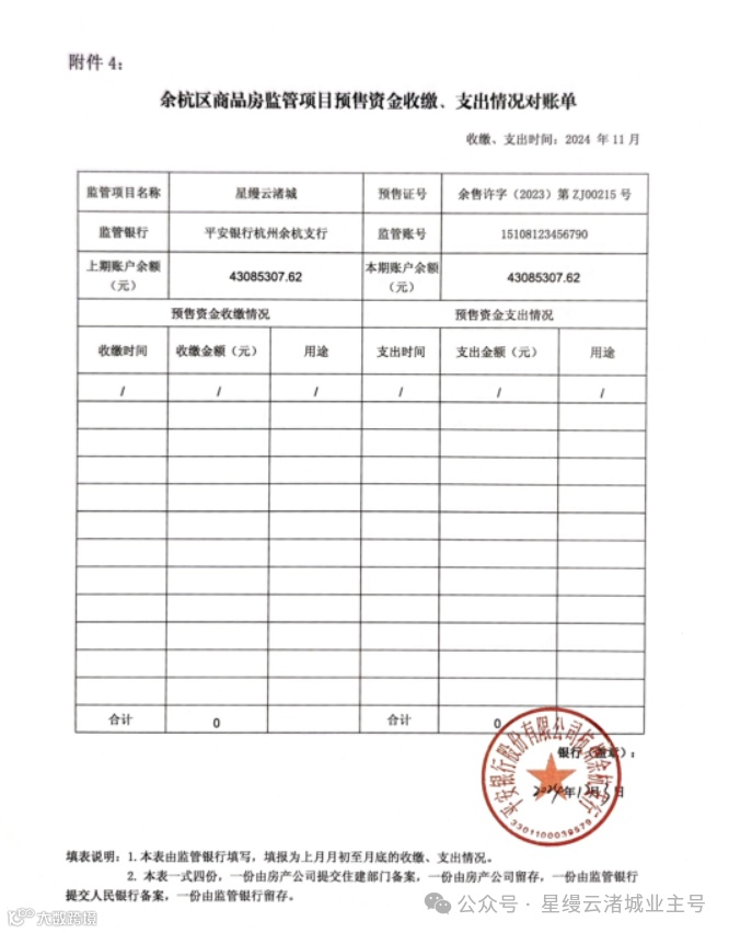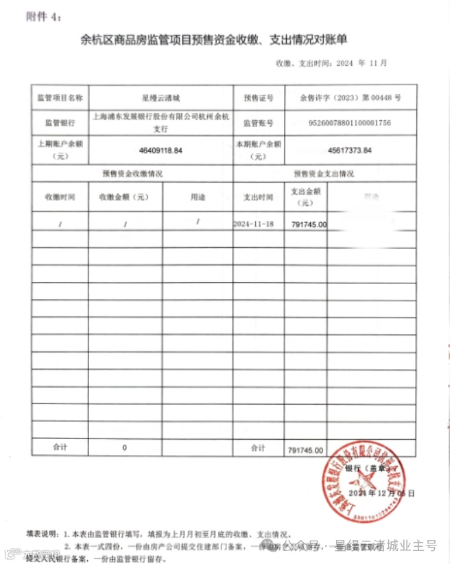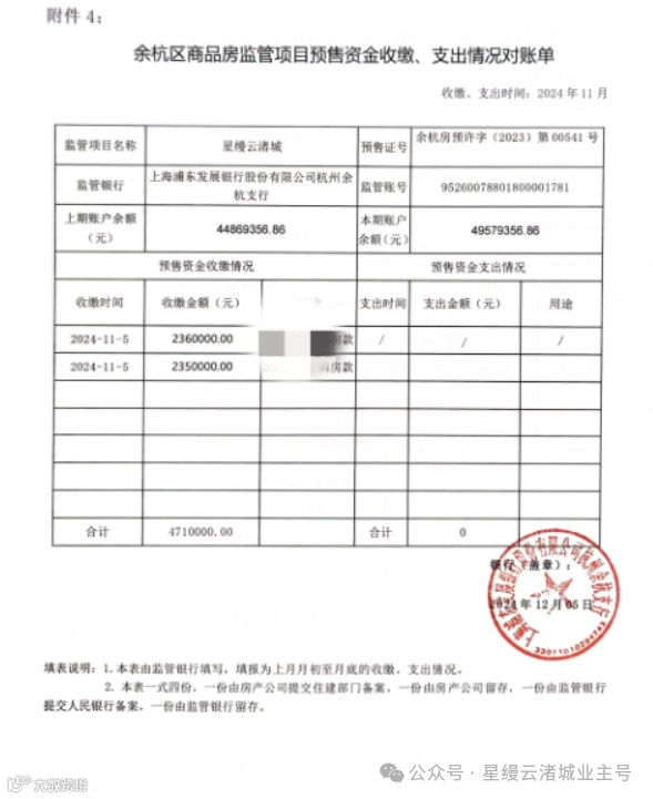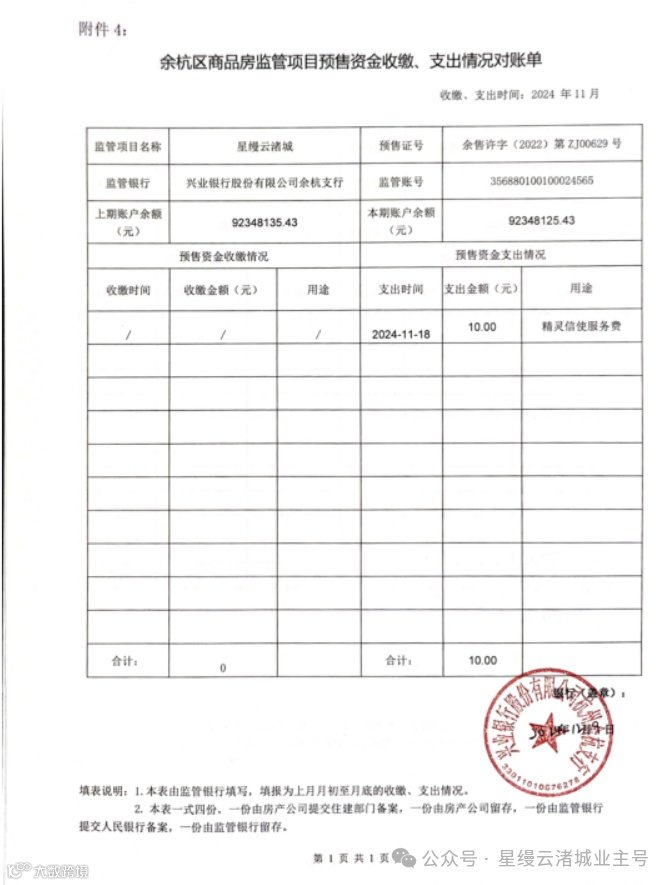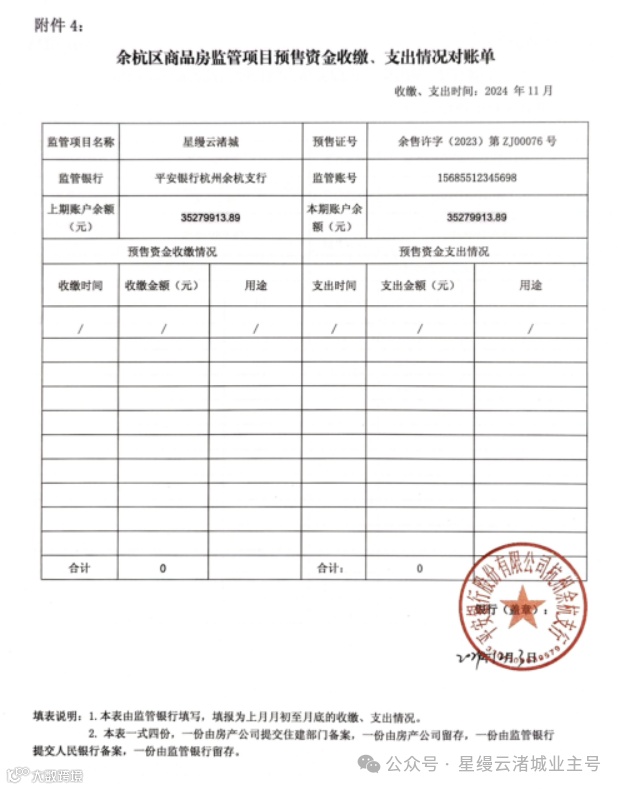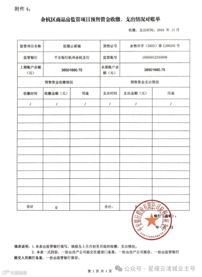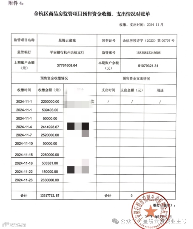 星缦云渚预售监管资金对账单|11月
