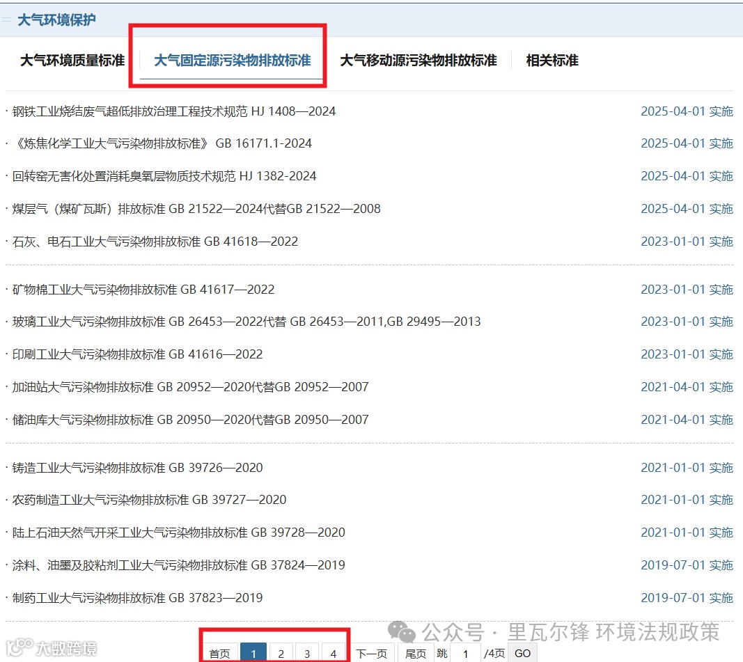 大气固定源排放标准,部网站有4页共计47项目(包括已废止),当然,归类到固废领域,水领域的行业标准中还有涉气的部分,这里不是统计有多少项大气排放标准,所以就不摘录划到水、固废的涉大气的标准。