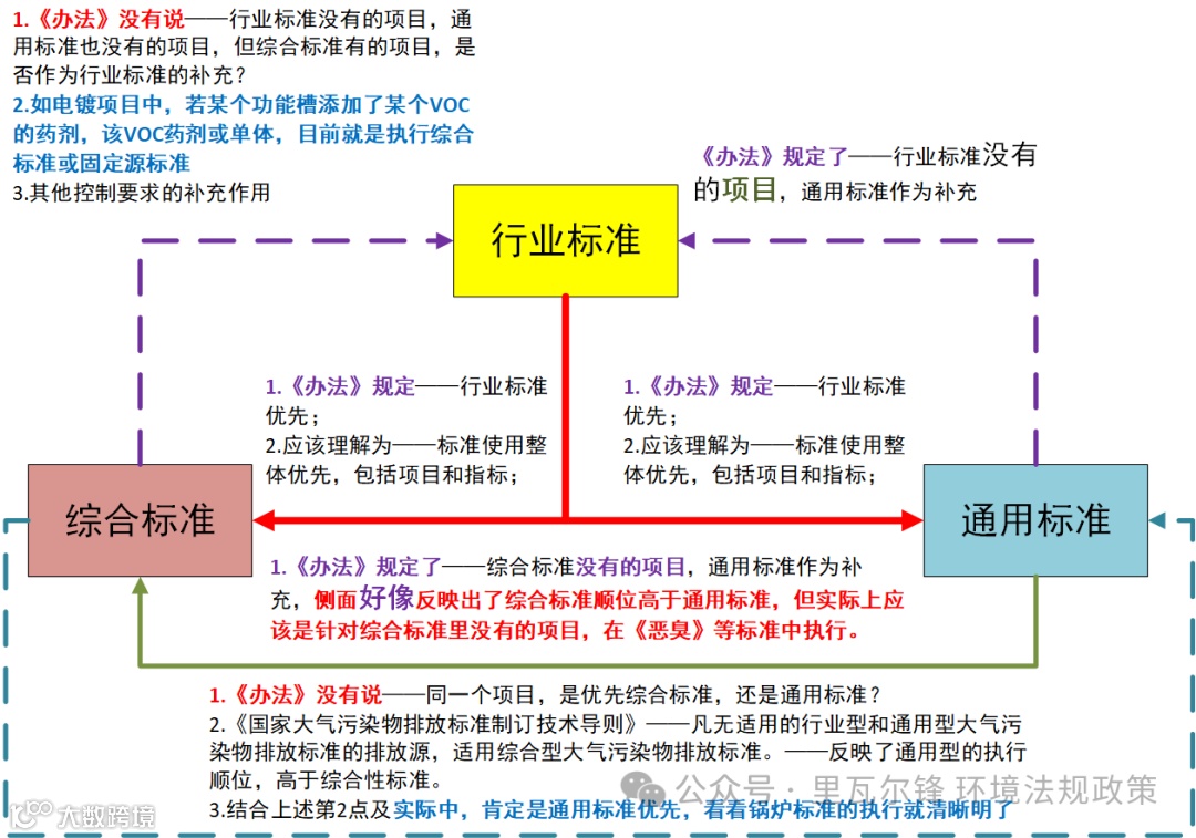 2.《国家大气污染物排放标准制订技术导则》(HJ 945.1—2018)——凡无适用的行业型和通用型大气污染物排放标准的排放源,(才)适用综合型大气污染物排放标准。——这里既反映了适用问题,也反应了综合标准的兜底作用(顺位低),通用型的执行顺位,高于综合性标准。