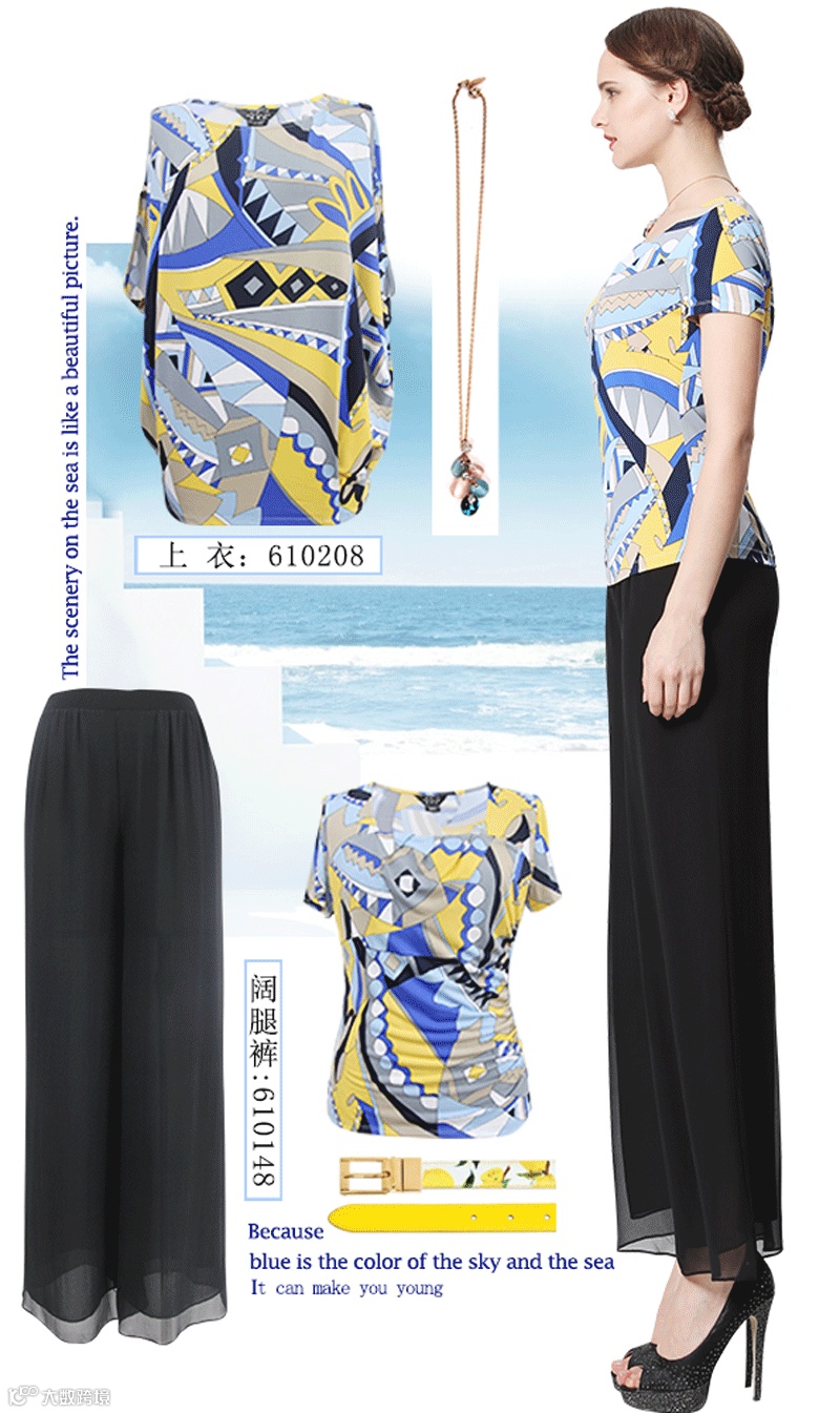 清新淡雅的海水蓝,焕发出青春的喜悦,将时尚进行到底。简约宽松的廓形,给身心更多的放松空间,尽情享受清凉的夏日时光。黑色阔腿裤飘逸自然,轻薄的真丝乔其面料,透气舒适,滋养肌肤,流畅的线条彰显出优雅气质。