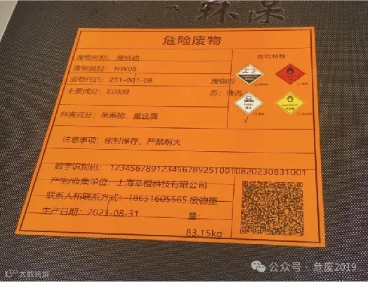 内容要素:废物名称、类别代码(依据《国家危险废物名录》)、危险特性标识(如腐蚀性、毒性、易燃性、反应性)、主要/有害成分、产生单位及联系人、数字识别码(唯一追溯编码)及二维码(信息化管理载体)、产生日期与重量。