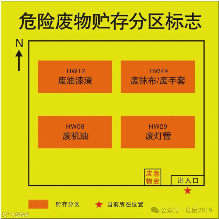 设置细则:依据废物类别、形态及相容性划分分区,每个分区入口处的通道、墙壁或栏杆等易观察位置设置标志,尺寸按观察距离确定,并随贮存废物种类变化动态调整标志内容。