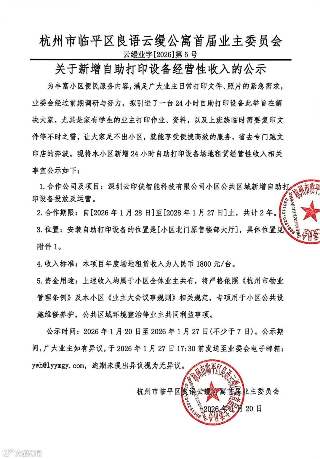 【云缦业字【2026】第5号】公示:关于新增自助打印设备经营性收入的公示