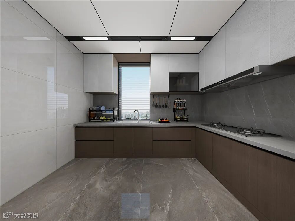 L型厨房里,深棕地柜沉稳如大地,白色定制吊柜轻盈似流云,博格铝蜂窝大板悬于顶上,抗油耐污。台面映照忙碌身影,智能厨电悄然嵌入,煎炒声伴着笑语,烟火日常亦是美学修行。