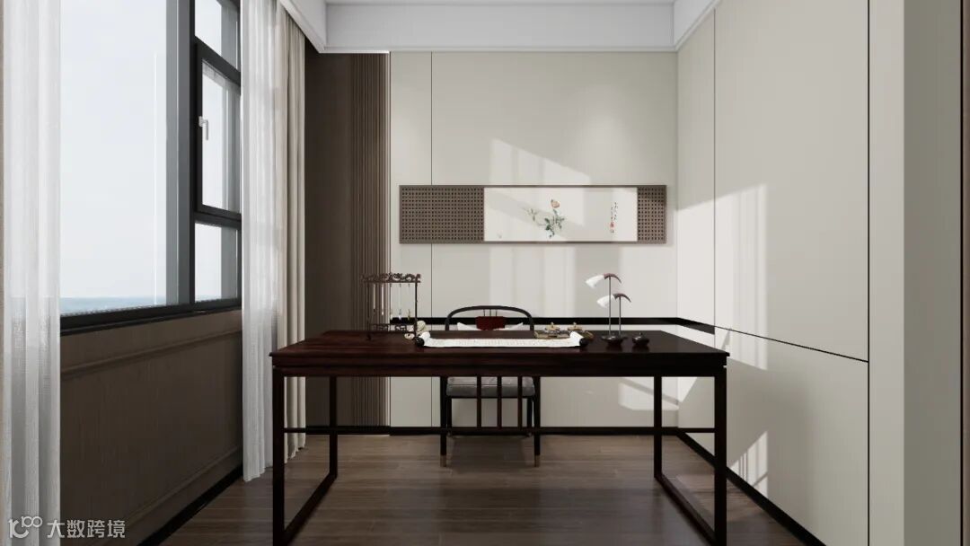 独立书房,是精神的自留地。整墙香薰百合临窗沐光,一个同色书桌陈列文房四宝,品茶与书画皆宜。沉醉其中,让墨香与茶烟在此自由呼吸。
