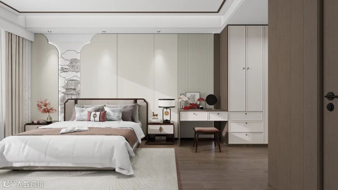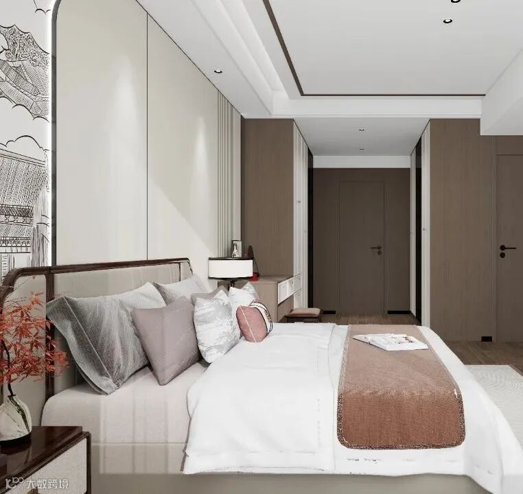 推门而入,是带步入式衣柜的私密空间。香薰百合色从墙面蔓延至定制衣柜,温润如月光流淌。床头一面不规则的中式背景墙,如云朵般的立体造型,拉升了卧室的雅致层次。