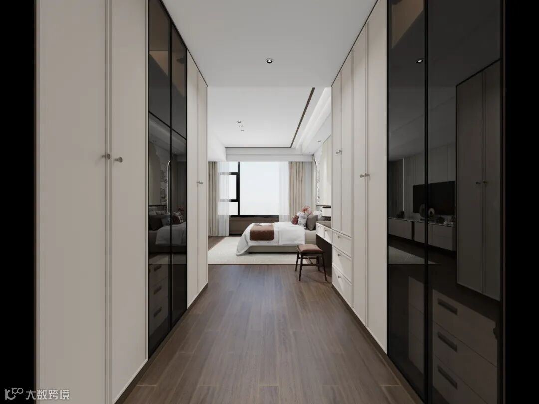 定制柜与梳妆台合二为一的设计,整齐划一,给了主人一份从容感。步入式衣帽间向卫生间延伸,一门到顶,不浪费一丝收纳。