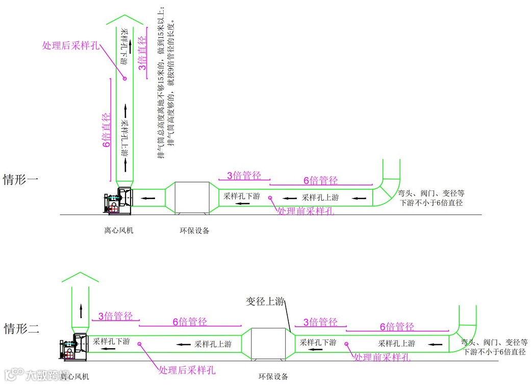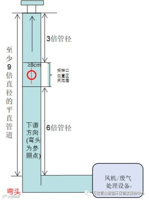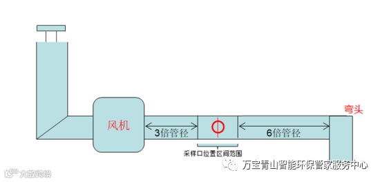 采样位置应优先选择在垂直管段,避开烟道弯头和断面急剧变化的部位,具体应设置在距弯头、阀门、变径管下游不小于6倍直径,和距上述部件上游方向不小于3倍直径处(对矩形烟道,取其当量直径,当量直径的计算方法D =2AB/(A+B),A、B是矩形烟道的边长)。这也是我们经常说的“前3后6”。